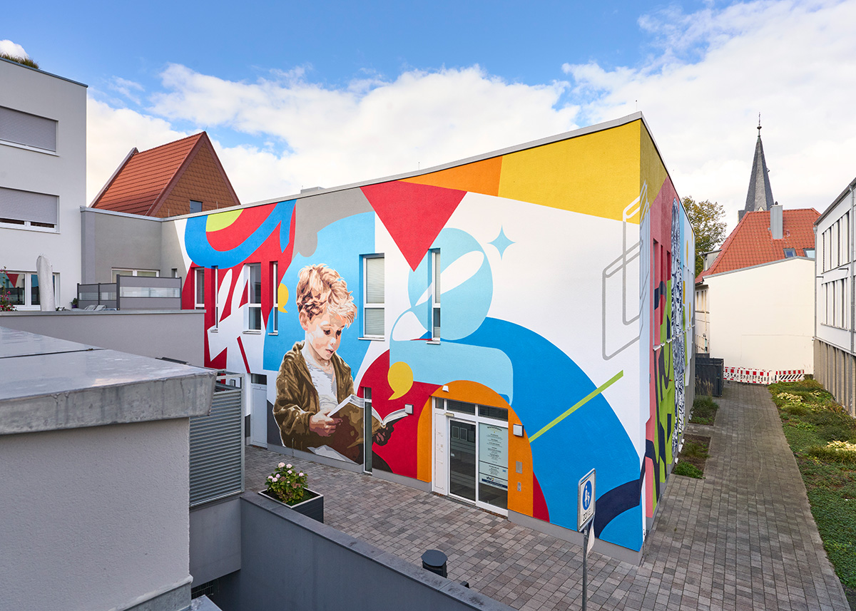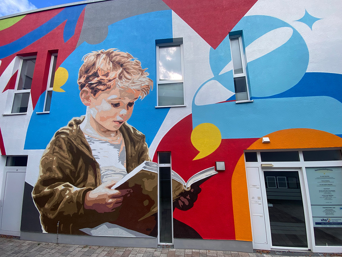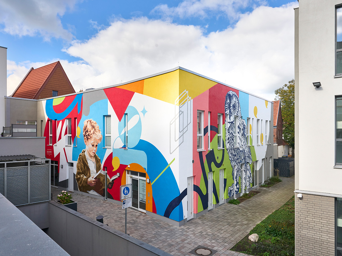 Im Jahr 2024 realisierten wir eine beeindruckende großflächige Wandgestaltung mit einer Fläche von ca. 800 m² an der Fassade der Stadtbücherei Lage in OWL. Diese exklusive Fassadengestaltung vereint moderne Kunst mit zeitgenössischer Ästhetik, um das Stadtbild zu bereichern und gleichzeitig eine tiefere Bedeutung zu vermitteln.