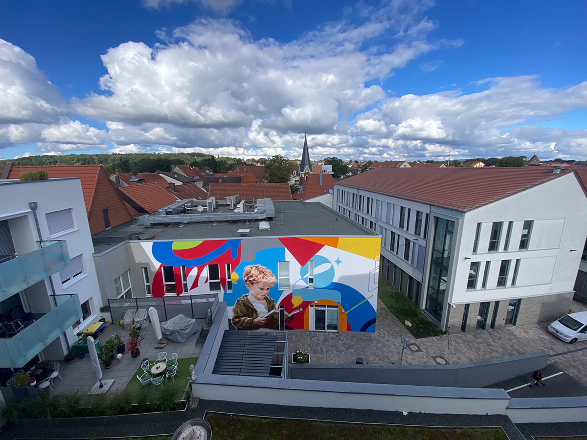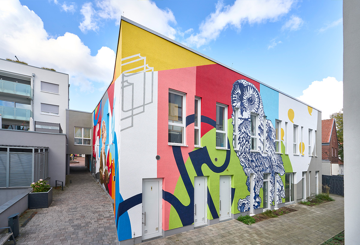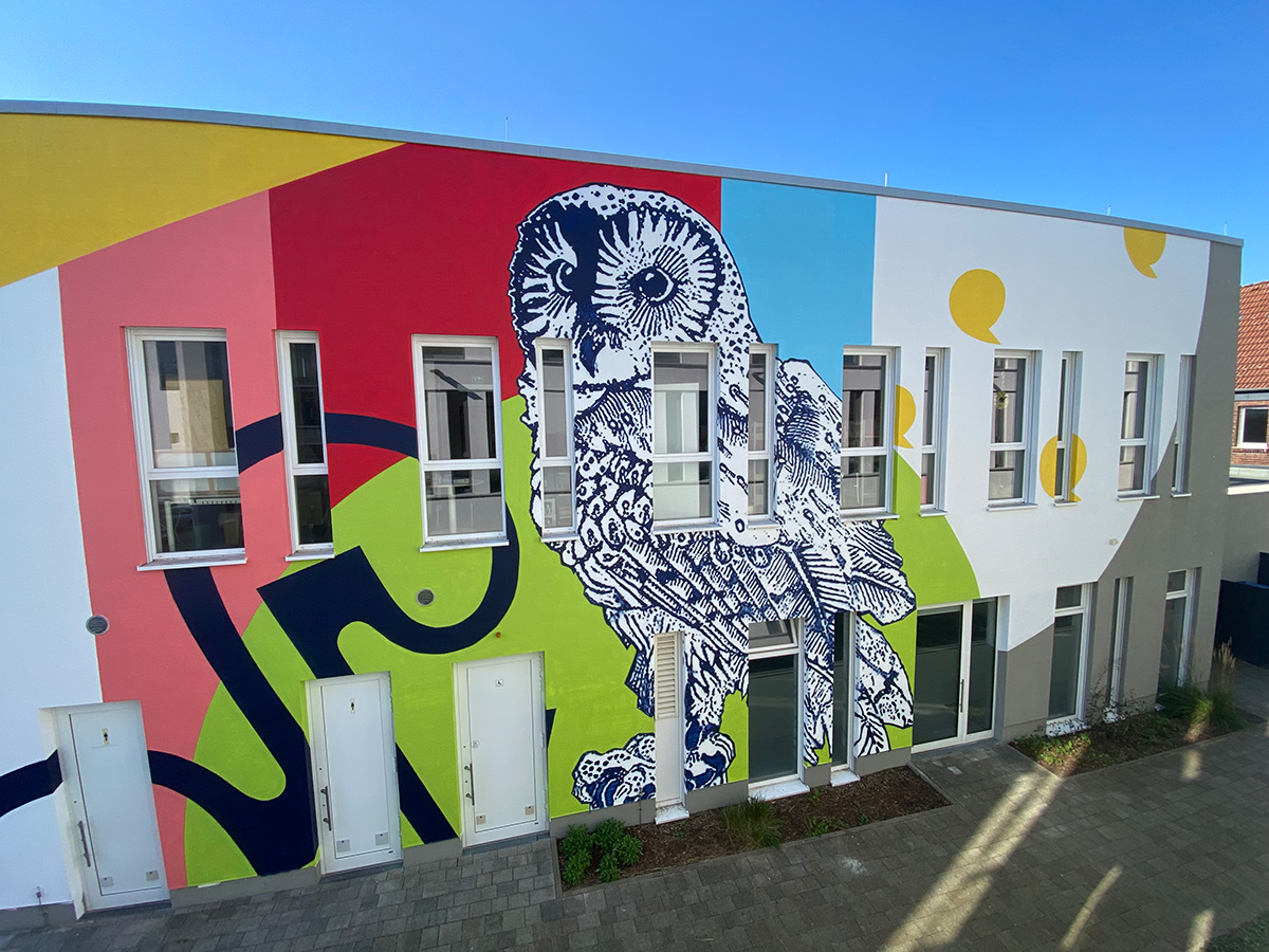Im Jahr 2024 realisierten wir eine beeindruckende großflächige Wandgestaltung mit einer Fläche von ca. 800 m² an der Fassade der Stadtbücherei Lage in OWL. Diese exklusive Fassadengestaltung vereint moderne Kunst mit zeitgenössischer Ästhetik, um das Stadtbild zu bereichern und gleichzeitig eine tiefere Bedeutung zu vermitteln.